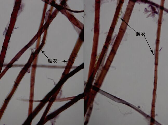 在200 倍鏡下,可觀察到構皮纖維具有明顯的細胞腔,但細胞腔大小不一。細胞壁上的橫節(jié)紋愈加明顯清晰,紋理深淺各異,大多數(shù)橫節(jié)紋跟纖維橫切面約成15~20°的夾角。部分纖維細胞的外壁包裹有一層透明膜,稱為膠衣(如圖3),一般多呈斷續(xù)狀,并會隨著纖維被處理程度的加重而減少,有些甚至被剝離成碎片飄散于纖維之間,在纖維的端部膠衣相對比較明顯。